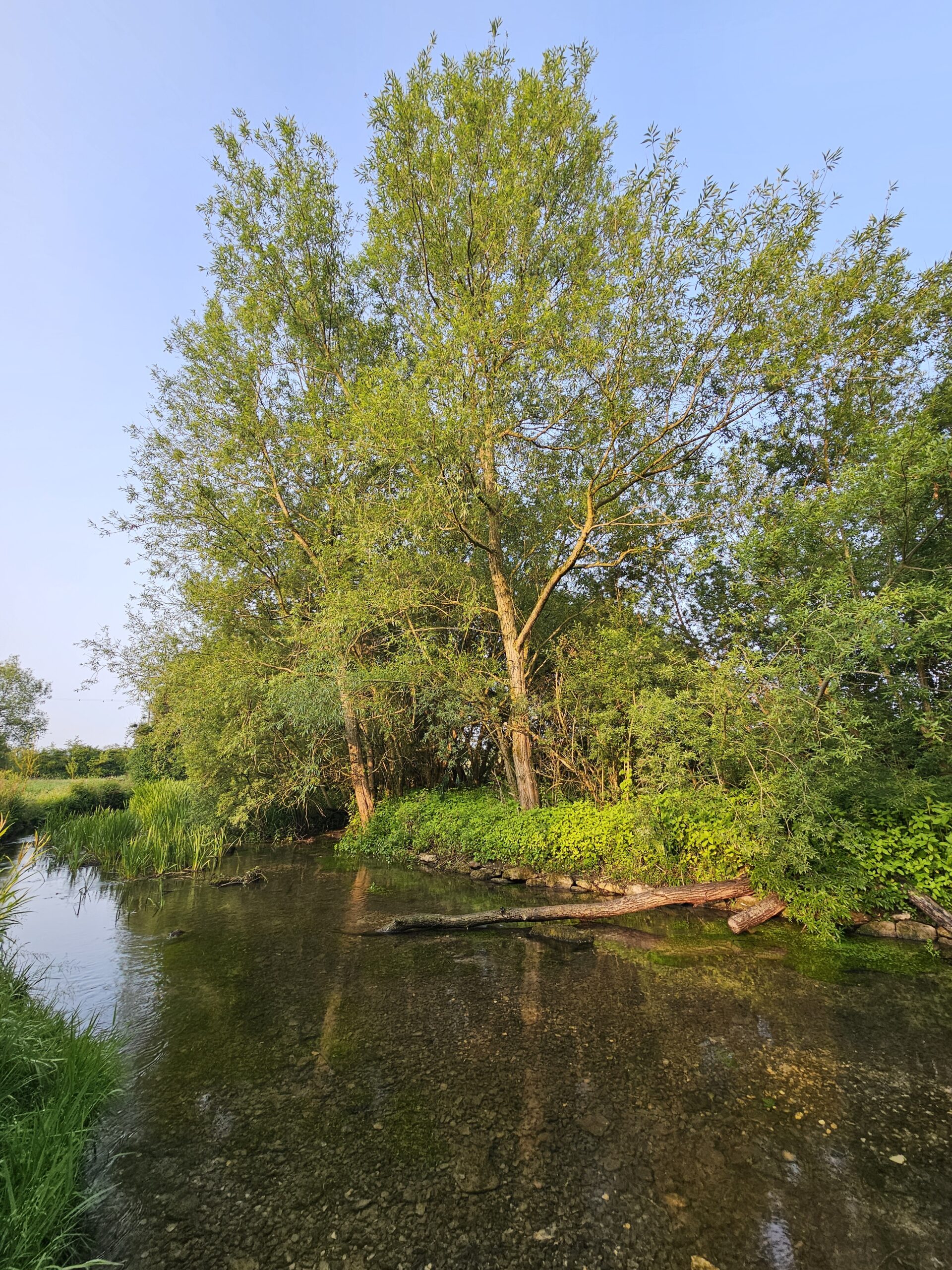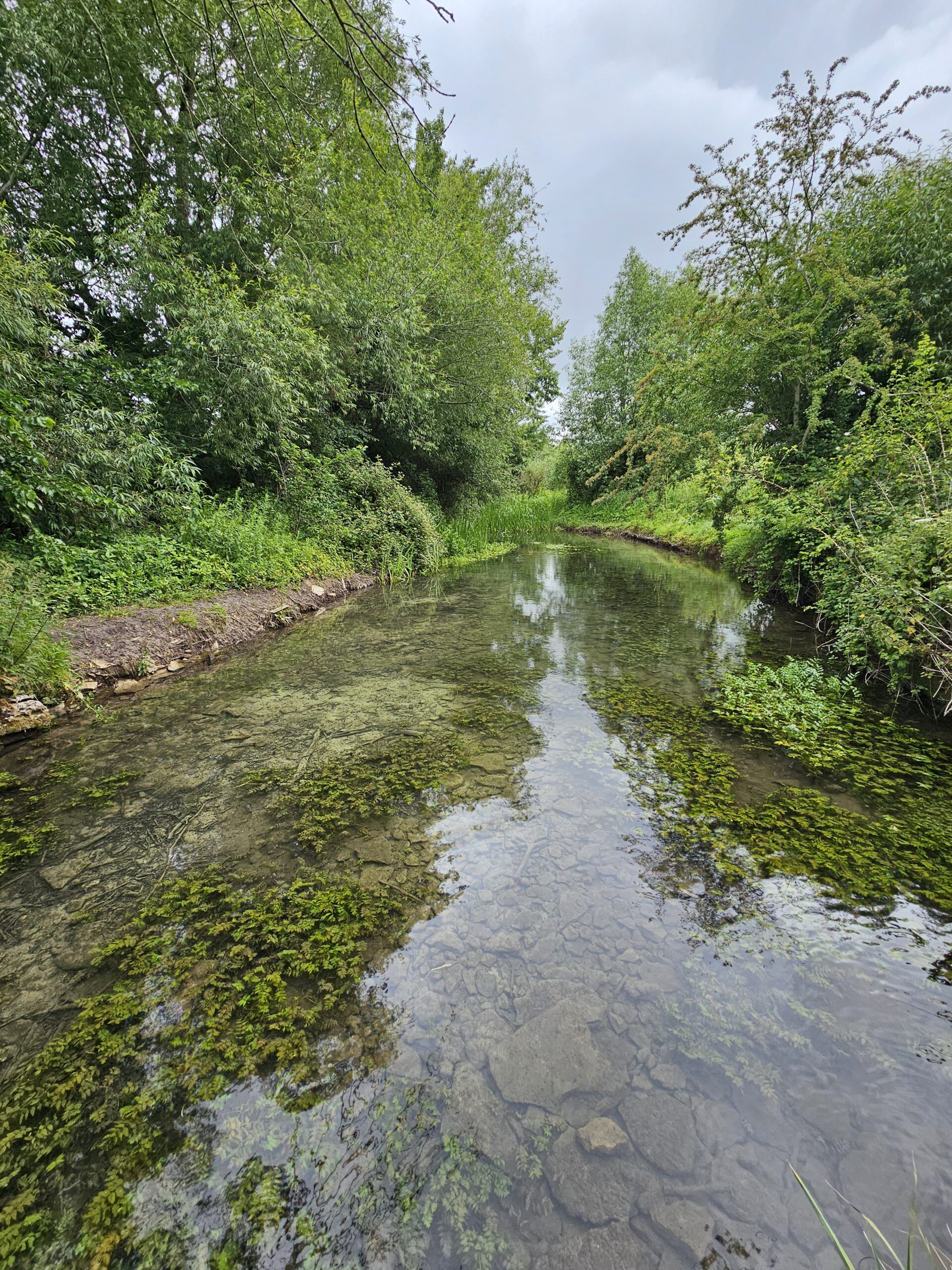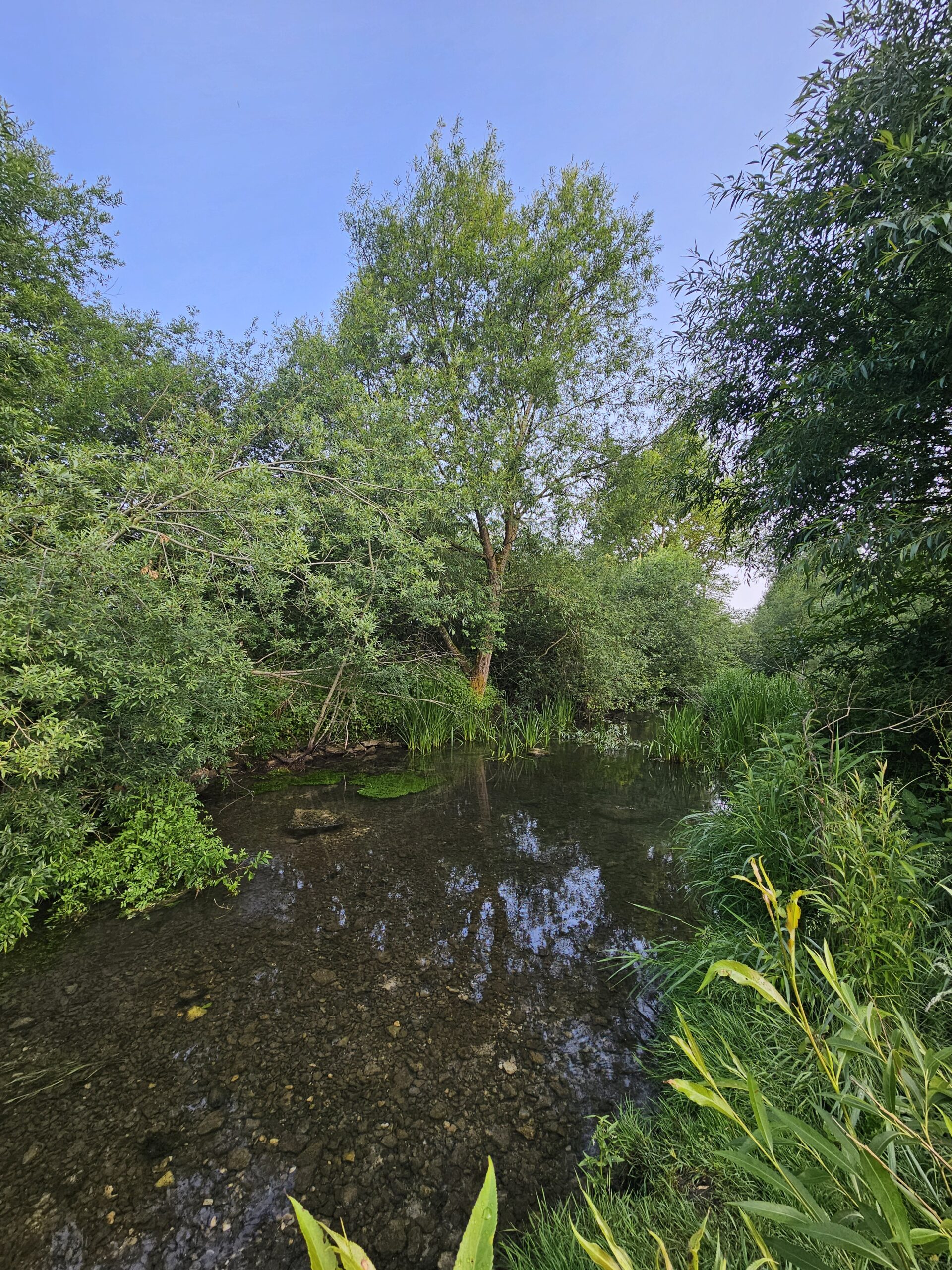 There is a hush here, not of silence but of ease. The river sings a modest song—soft glugs and gurgles, the chuckle of water over pebbles, an unhurried, contented voice. You kneel and see all the way to its cobbled bed. Sticklebacks dart in bursts, and a mayfly hovers in the sunbeam just above the surface, its moment brief but utterly vital. Reflections of alder and sky shift gently on the current. Time, if it still moves here, has taken off its watch.