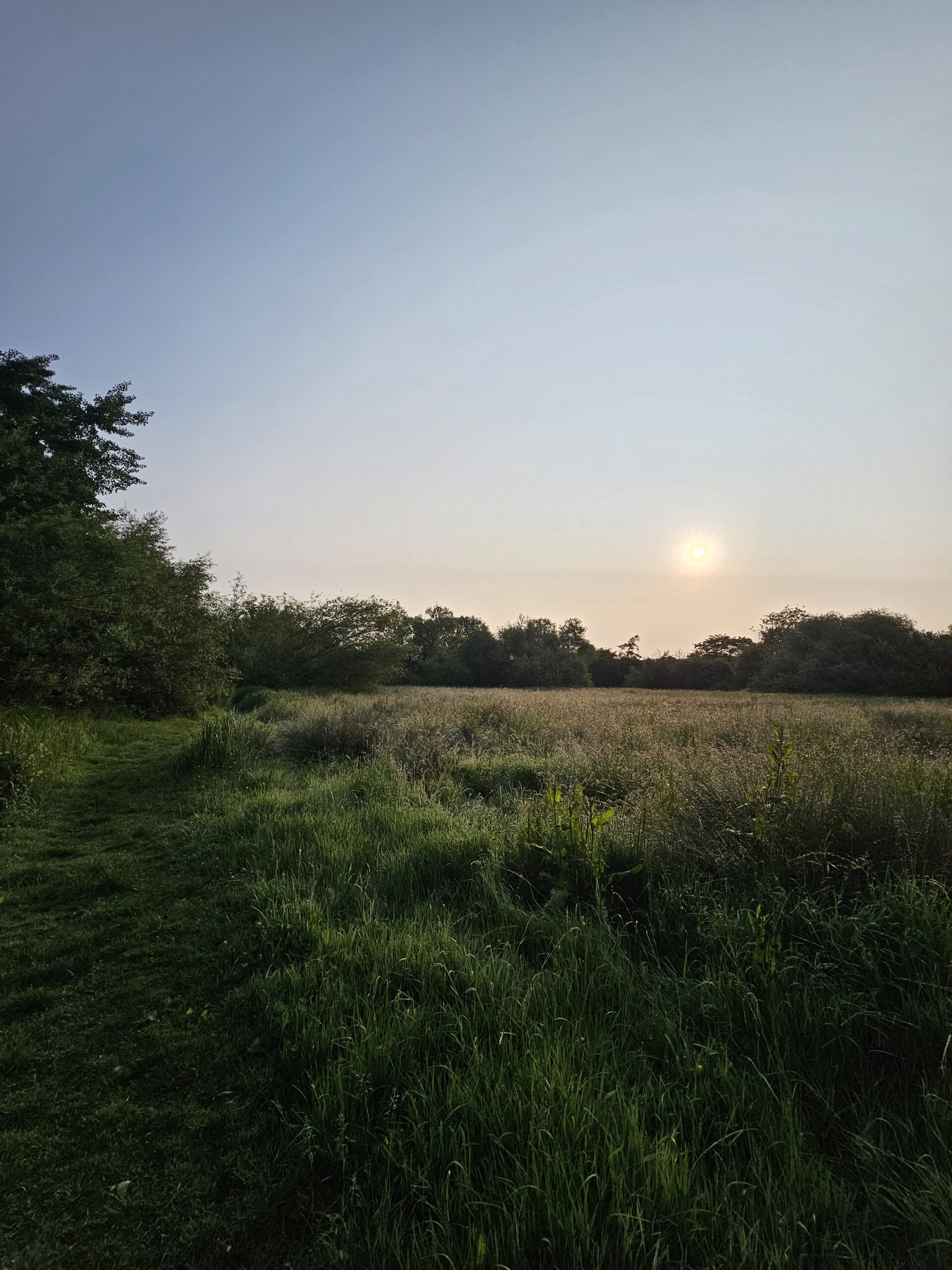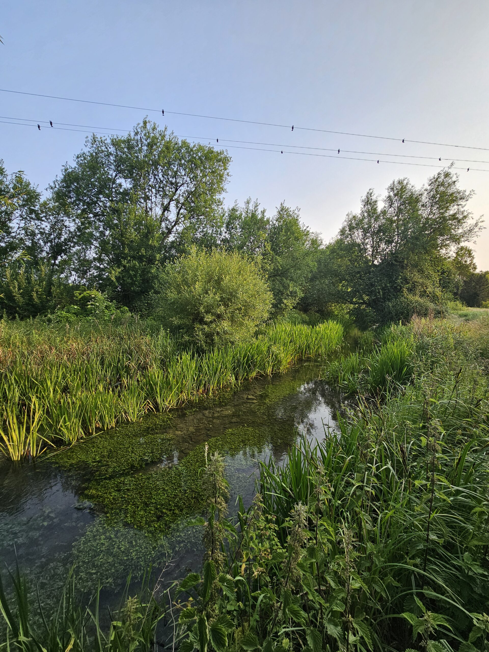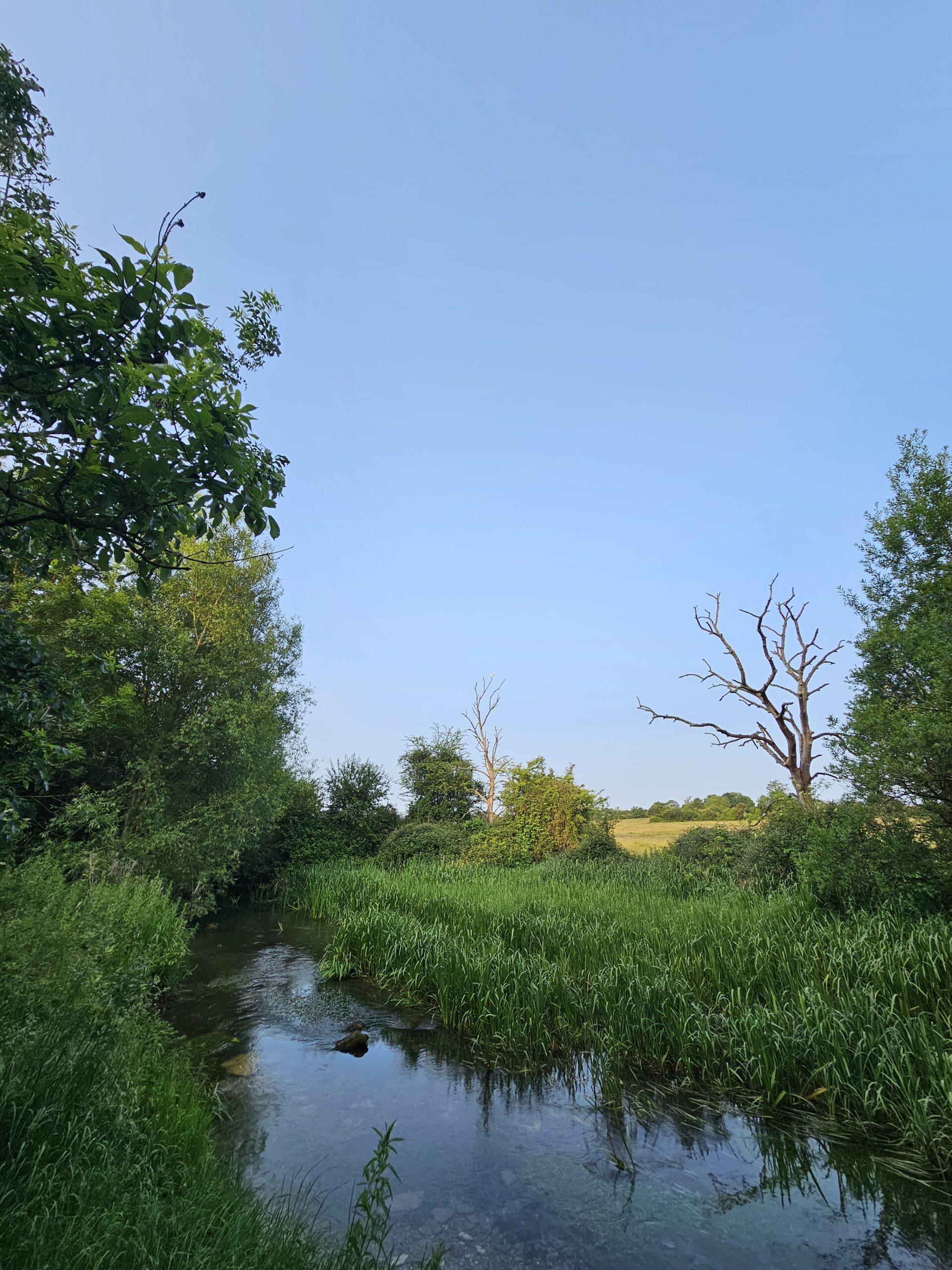 The path widens as you descend towards the river, and now the horizon opens. Grasses part in a gentle gradient of green to gold, heavy-headed with seed. A hare breaks cover ahead, long legs flashing before it vanishes into shadow. The Leach appears gradually, a shimmer glimpsed first through willow, then fully revealed: a clear, shallow run of water threading its way between banks shaggy with reeds and forget-me-not.
